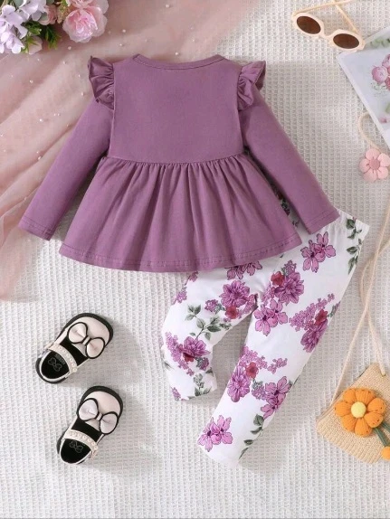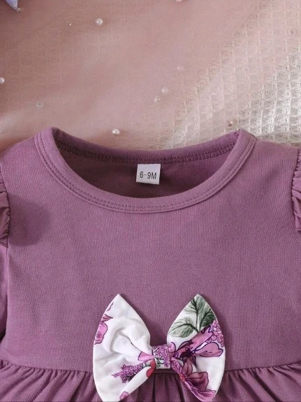 لباس علوي مطوي الثنايا طباعة الأزهار مقلم بكشكش عقدة الفراشة أمامية مع بنطلون